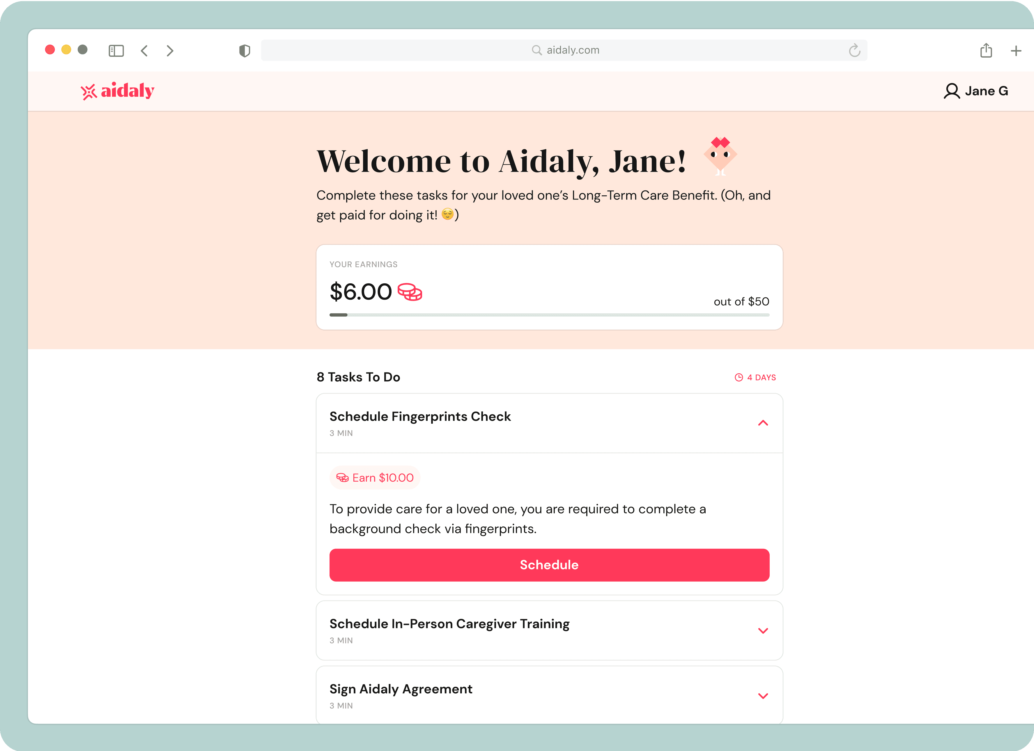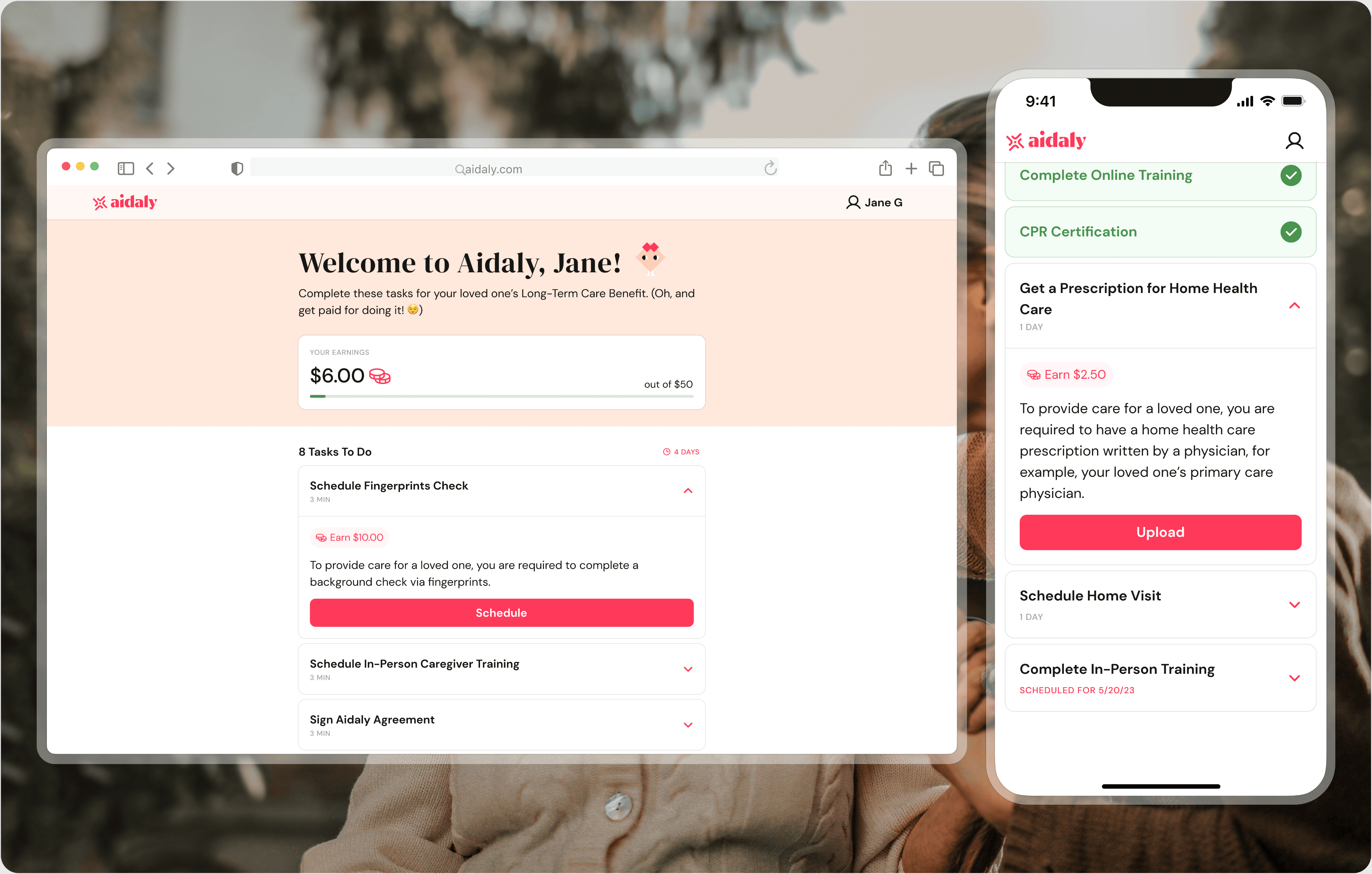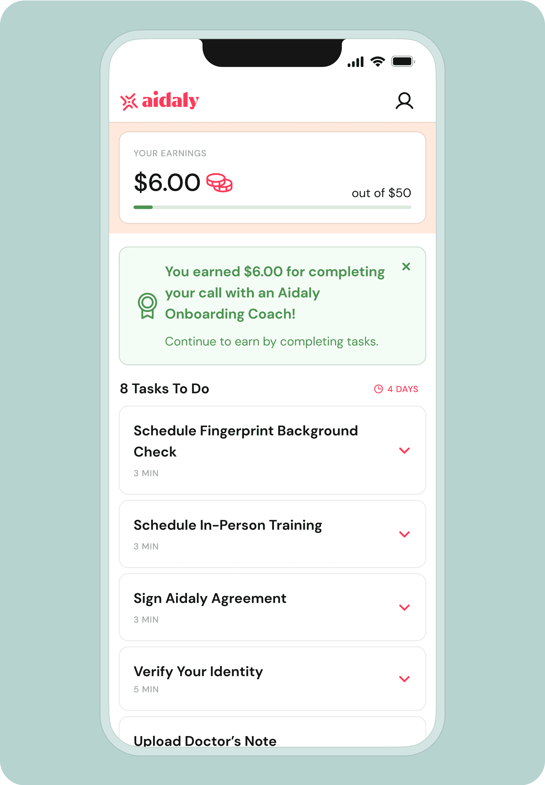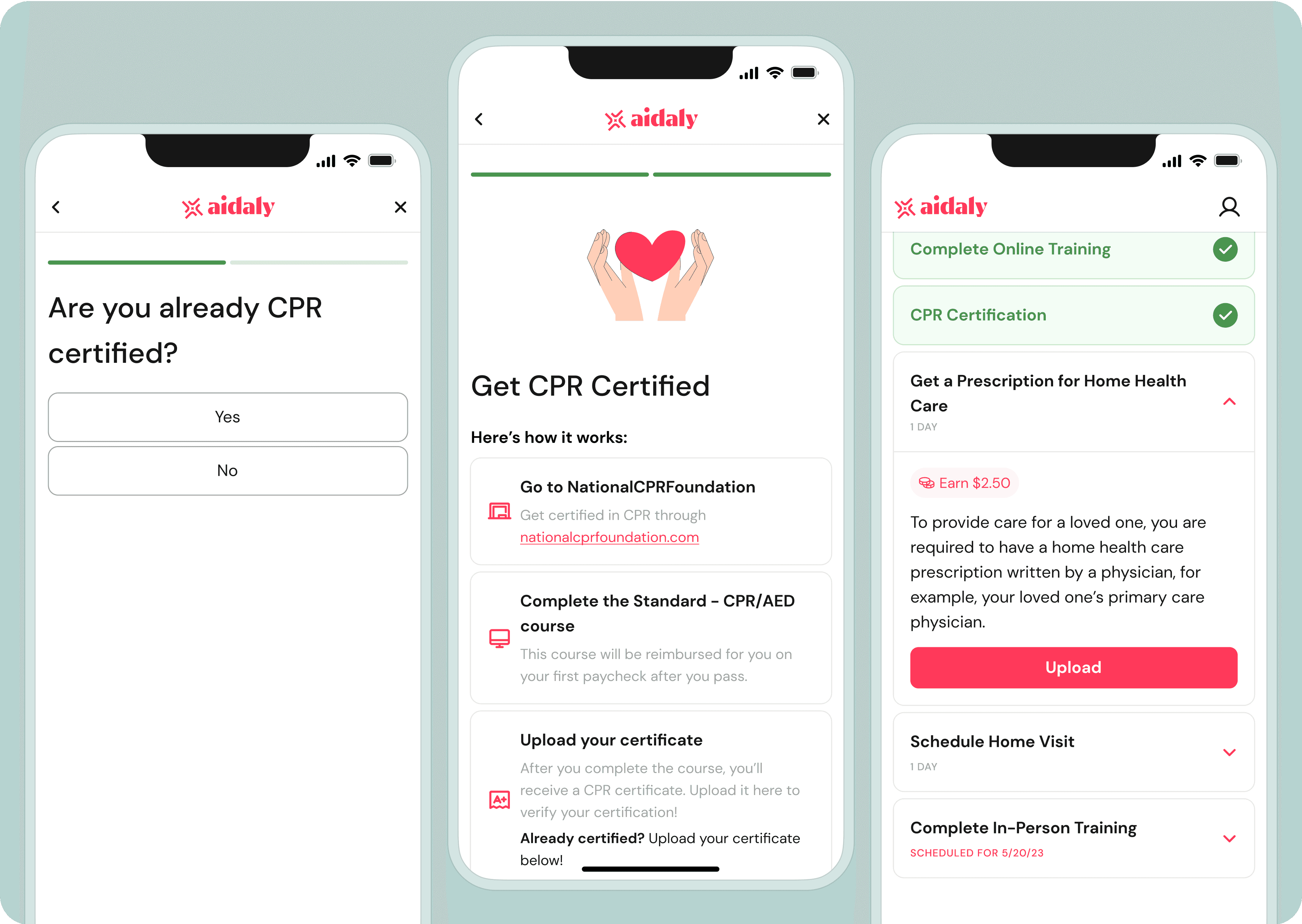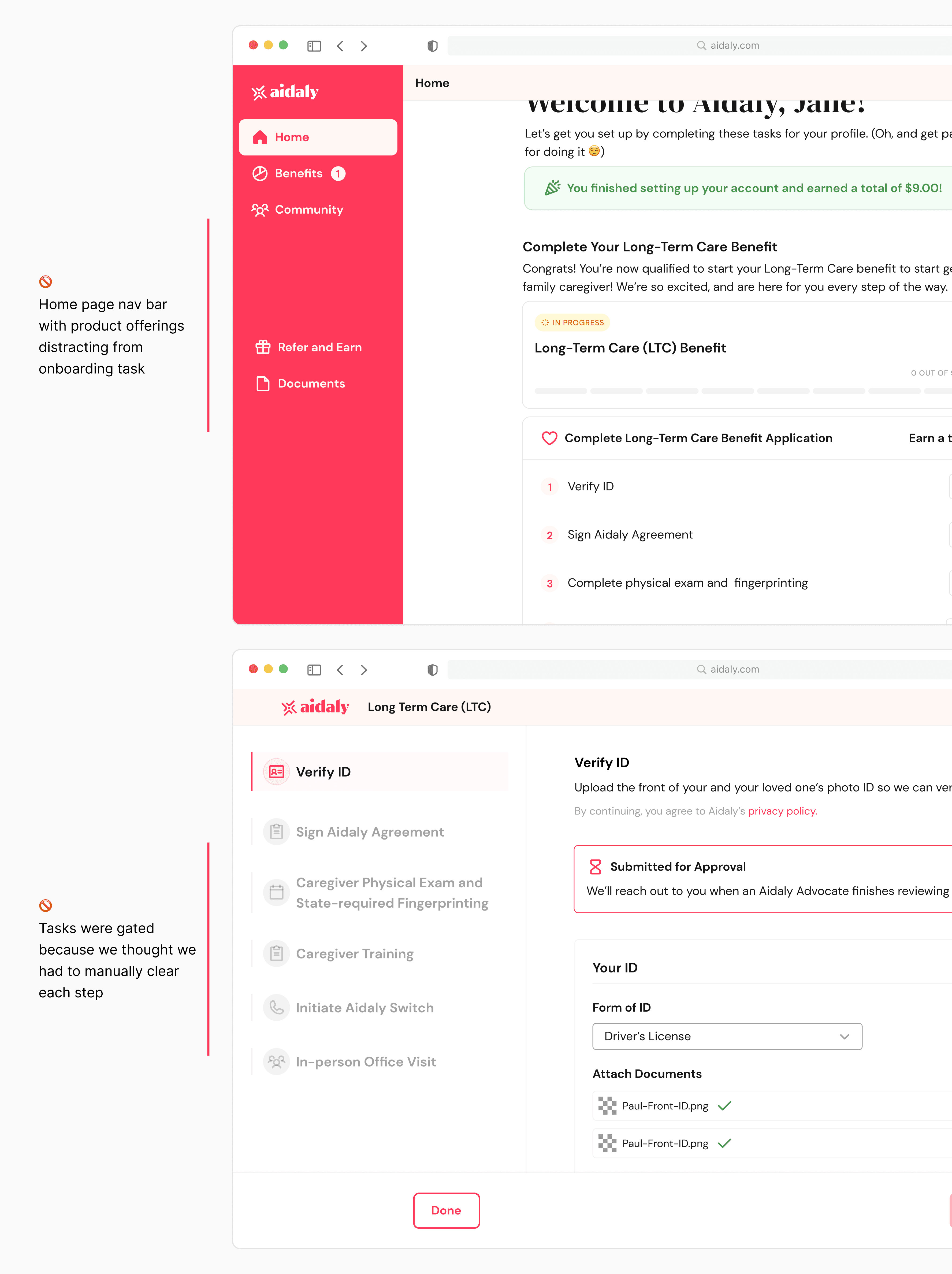 While Aidaly has several product offerings for caregivers to earn money, the benefits are the most rewarding. This means the journey should be prioritized and isolated from the rest of the product first to ensure successful completion rate.